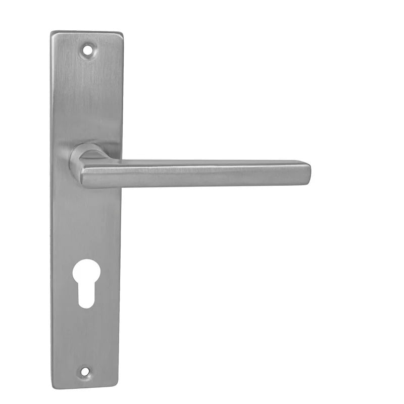 Štítová klika na interiérové ​​dveře s hranatým štítem je vyrobena z vysoce kvalitní nerezavějící oceli, známé jako nerez a je povrchově upravena. Hranatý štít má rozměry 42 mm x 218 mm.