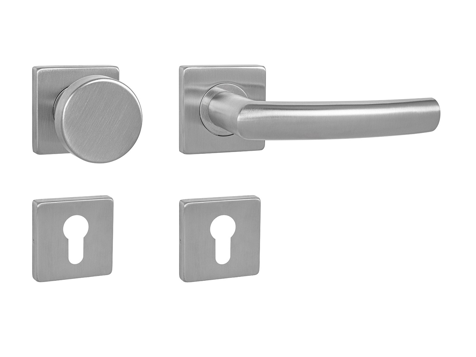 Rozetová klika na interiérové dveře s hranatou rozetou je vyrobena z vysoce kvalitní nerezavějící oceli, známé jako nerez a je povrchově upravena. Rozeta má rozměry 54 mm x 54 mm a tloušťku 9 mm. Je barevně stabilní a odolná vůči opotřebení. Kování je testované podle normy ČSN EN 1906:2012 na 200 000 cyklů.