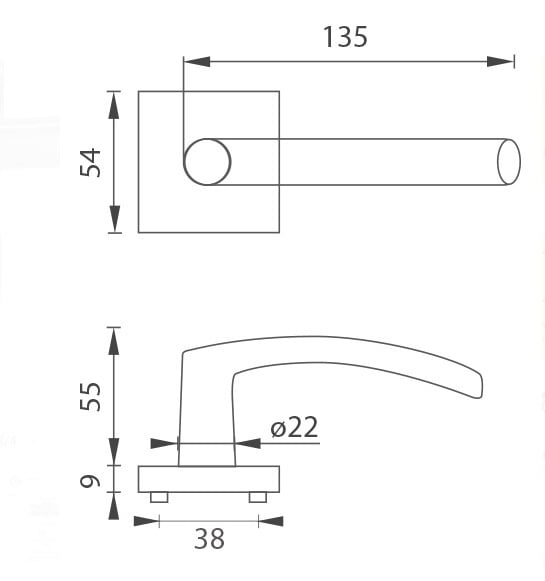 Rozetová klika na interiérové dveře s hranatou rozetou je vyrobena z vysoce kvalitní nerezavějící oceli, známé jako nerez a je povrchově upravena. Rozeta má rozměry 54 mm x 54 mm a tloušťku 9 mm. Je barevně stabilní a odolná vůči opotřebení. Kování je testované podle normy ČSN EN 1906:2012 na 200 000 cyklů.