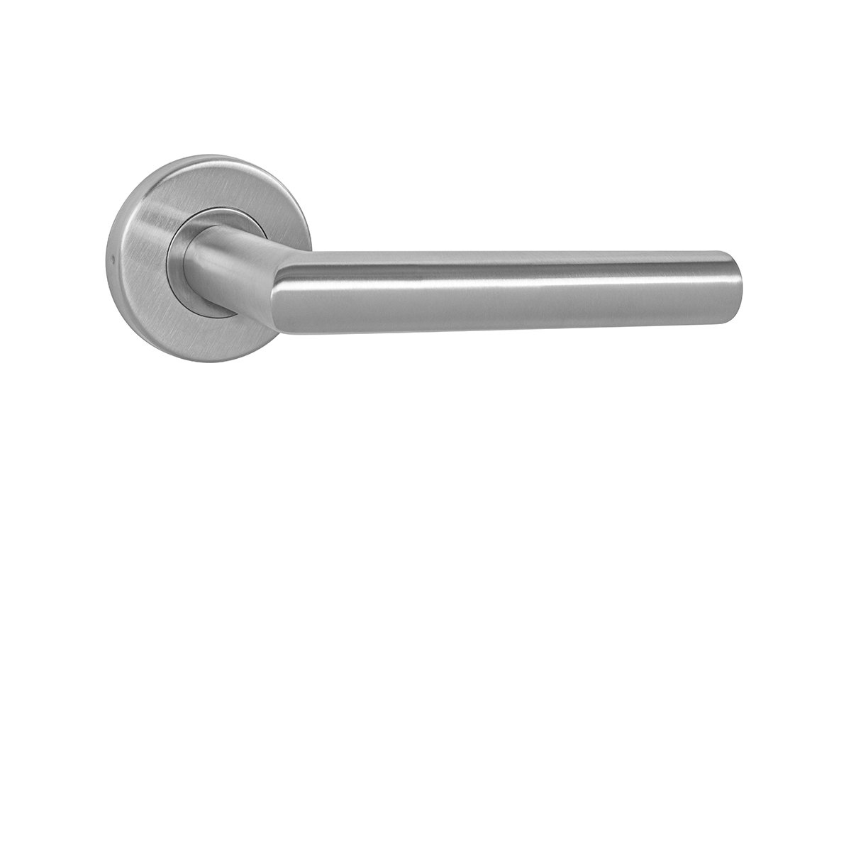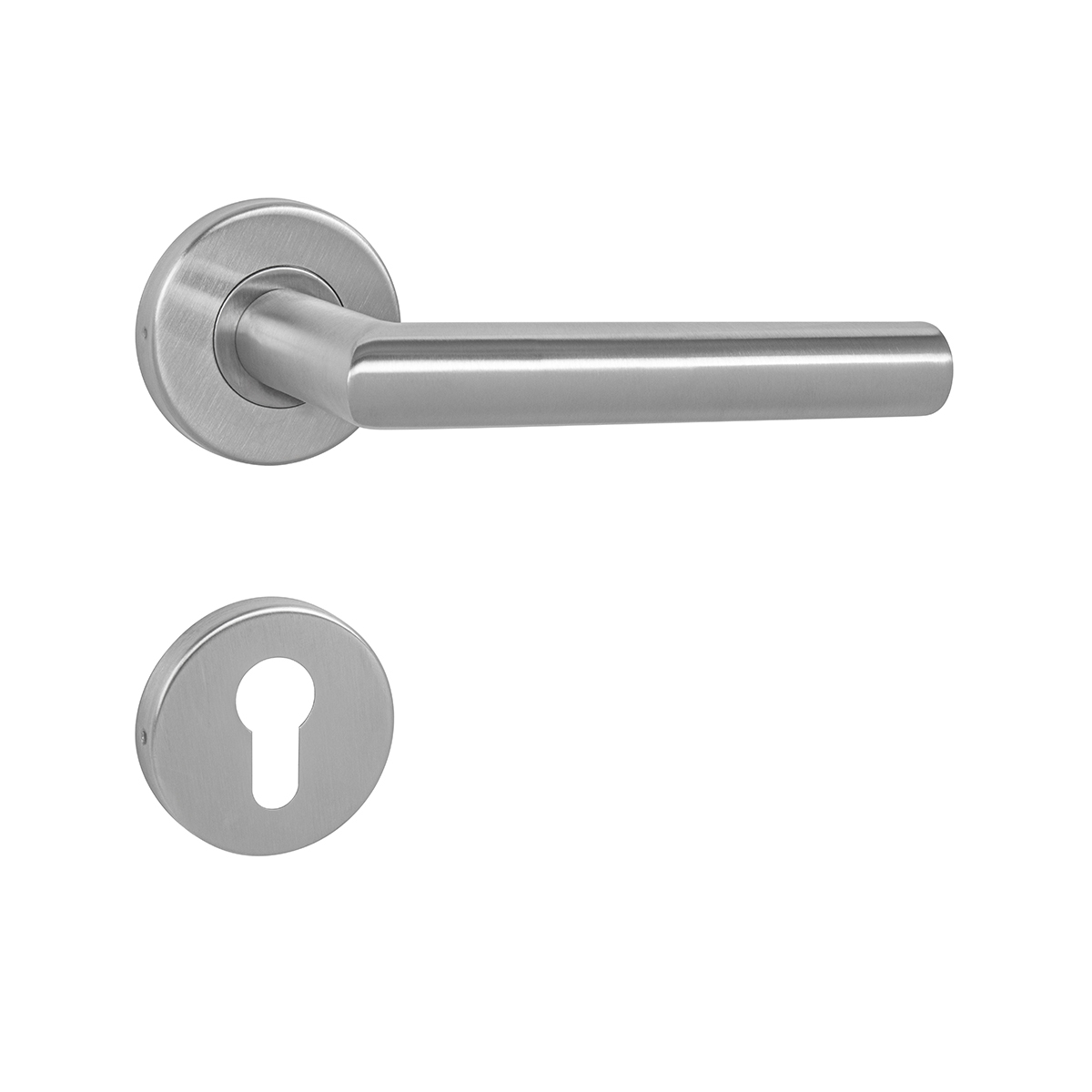 Rozetová klika na interiérové ​​dveře s kulatou rozetou z kvalitní nerezavějící oceli, známé jako nerez a je povrchově upravena. Rozeta má průměr 54 mm a tloušťku 9 mm. Je barevně stabilní a odolná vůči opotřebení. Kování je testováno dle normy ČSN EN 1906: 2012 na 200 000 cyklů.