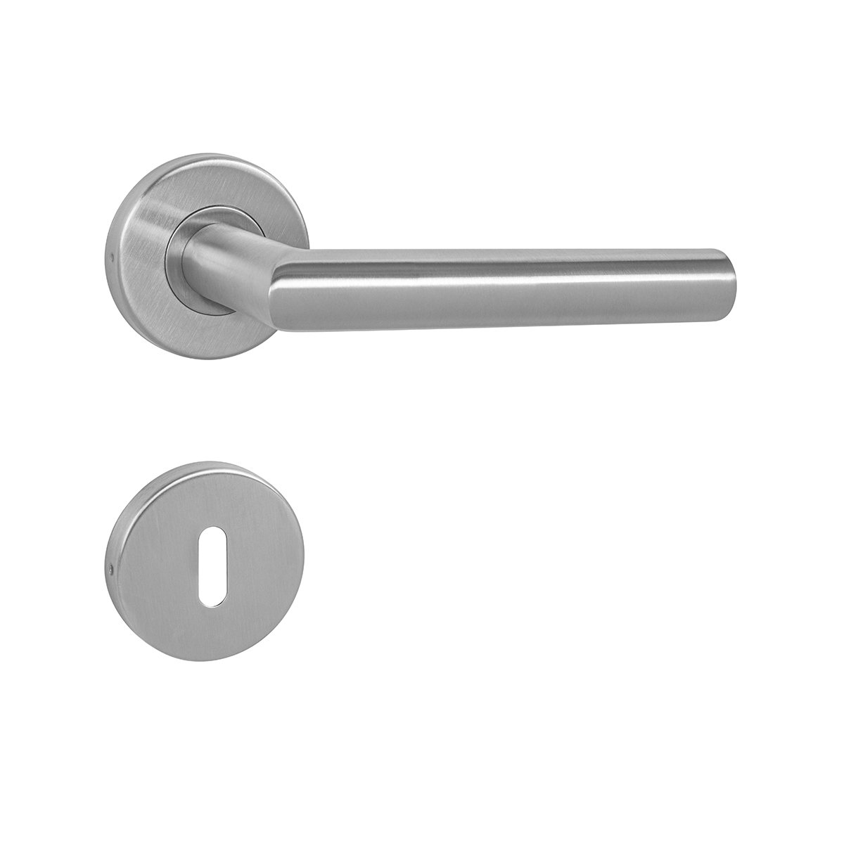 Rozetová klika na interiérové ​​dveře s kulatou rozetou z kvalitní nerezavějící oceli, známé jako nerez a je povrchově upravena. Rozeta má průměr 54 mm a tloušťku 9 mm. Je barevně stabilní a odolná vůči opotřebení. Kování je testováno dle normy ČSN EN 1906: 2012 na 200 000 cyklů.