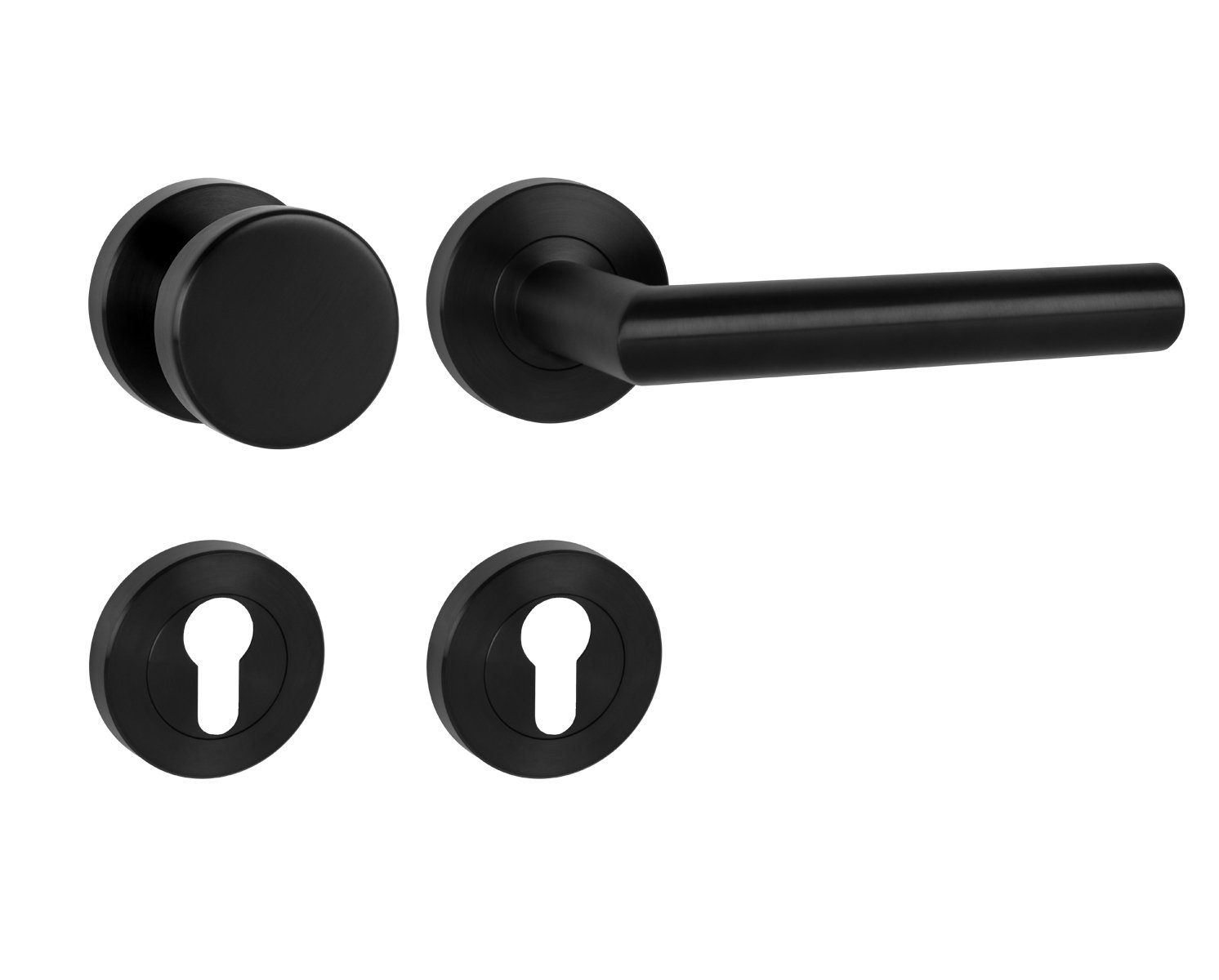 Rozetová klika na interiérové dveře s kulatou šroubovací rozetou představuje kombinaci funkčnosti a elegance pro prostředí s vysokou zátěží. Je vyrobena z vysoce kvalitní nerezavějící oceli, známé jako nerez a je povrchově upravená. Černý matný povrch je nanesen vysoce kvalitní technologií pokovování PVD, na kterou se vztahuje prodloužená 10letá záruka. Krycí rozety jsou upevněny vnitřním závitem bez viditelných spojů, který zaručuje extrémně pevný spoj a hladké přilnutí k povrchu dveří. Ergonomický úchop se seříznutou hranou poskytuje pohodlí při každém doteku. Klika je díky své robustní konstrukci obzvlášť vhodná pro prostředí s vysokou frekvencí pohybu osob, jako jsou kanceláře, veřejné budovy, nemocnice, čerpací stanice apod.