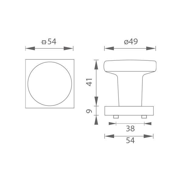 Dveřní pevná přímá koule na hranaté rozetě je vyrobena z vysoce kvalitní nerezavějící oceli, známé jako nerez a je povrchově upravena. Koule má průměr 49 mm a hranatá rozeta má rozměry 54 mm x 54 mm a tloušťku 9 mm.