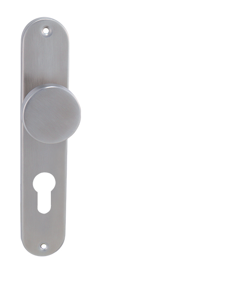 Dveřní pevná přímá koule na oválném štítě je vyrobena z vysoce kvalitní nerezavějící oceli, známé jako nerez a je povrchově upravena. Koule má průměr 49 mm a štít má rozměry 42 mm x 225 mm.