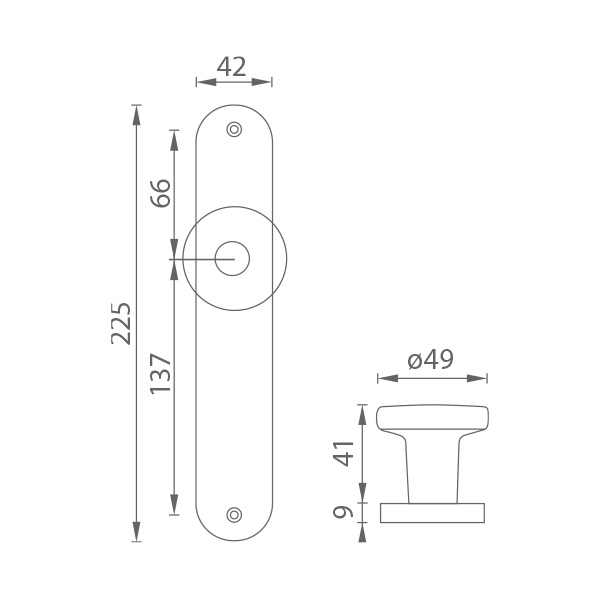 Dveřní pevná přímá koule na oválném štítě je vyrobená z vysoce kvalitní nerezavějící oceli, známé jako nerez a je povrchově upravená. Koule má průměr 49 mm a štít má rozměry 42 mm x 225 mm.