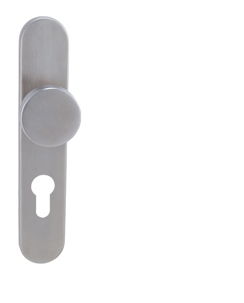 Dveřní pevná přímá koule na dlouhém oválném štítě je vyrobena z vysoce kvalitní nerezavějící oceli, známé jako nerez a je povrchově upravena. Koule má průměr 49 mm a štít má rozměry 42 mm x 236 mm.