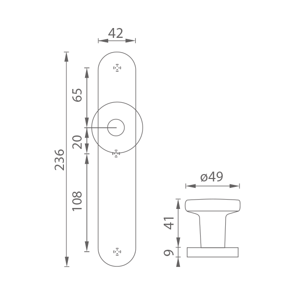 Dveřní pevná přímá koule na dlouhém oválném štítě je vyrobena z vysoce kvalitní nerezavějící oceli, známé jako nerez a je povrchově upravena. Koule má průměr 49 mm a štít má rozměry 42 mm x 236 mm.