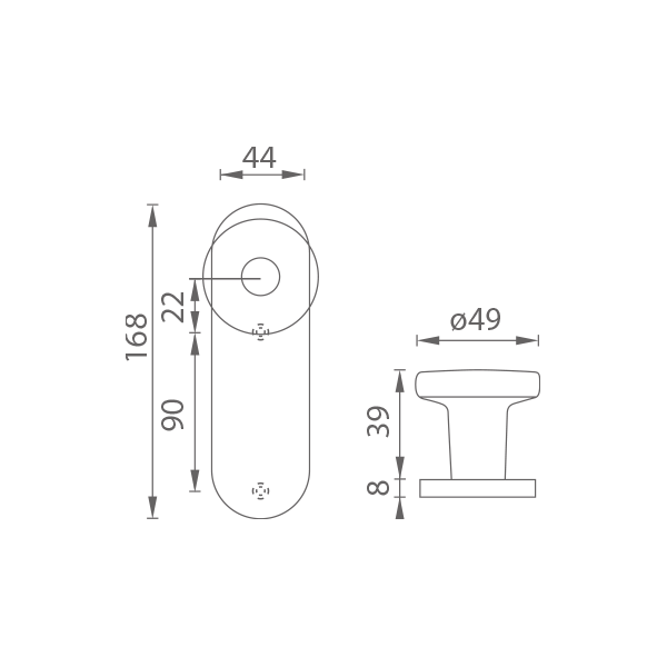 Dveřní pevná přímá koule na krátkém oválném štítě je vyrobena z vysoce kvalitní nerezavějící oceli, známé jako nerez a je povrchově upravena. Koule má průměr 49 mm a štít má rozměry 44 mm x 168 mm.