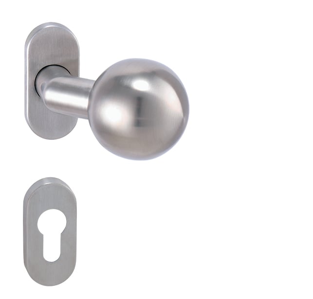 Dveřní VYOSENÁ koule na úzké oválné rozetě je vyrobená z vysoce kvalitní nerezavějící oceli, známé jako nerez a je povrchově upravená.