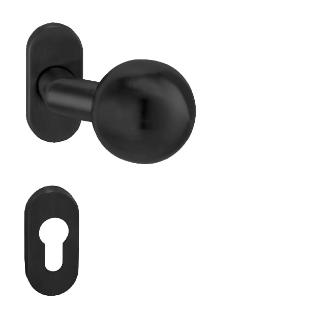 Dveřní VYOSENÁ koule na úzké oválné rozetě je vyrobená z vysoce kvalitní nerezavějící oceli, známé jako nerez a je povrchově upravená.