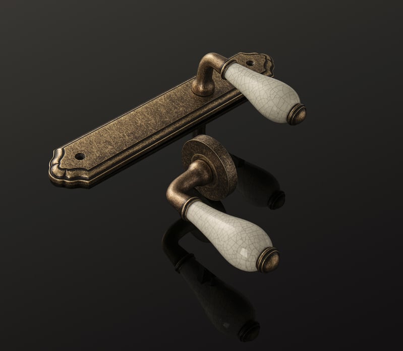 Štítová klika na interiérové dveře s oválným štítem je vyrobená z kvalitní slitiny zinku v kombinaci s porcelánem a je povrchově upravená.