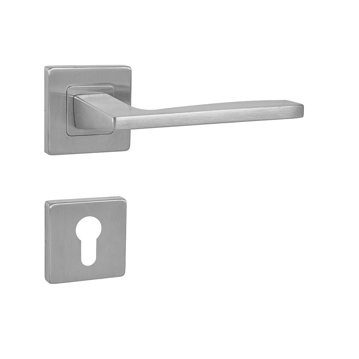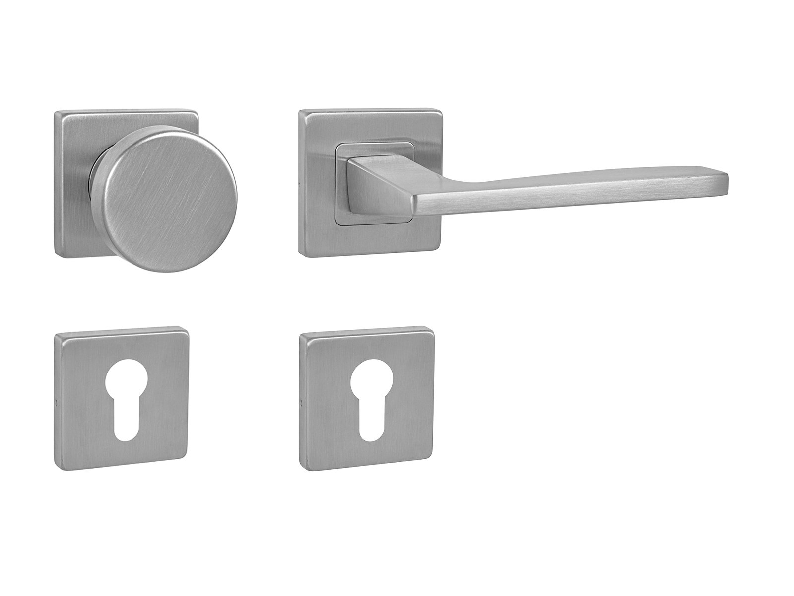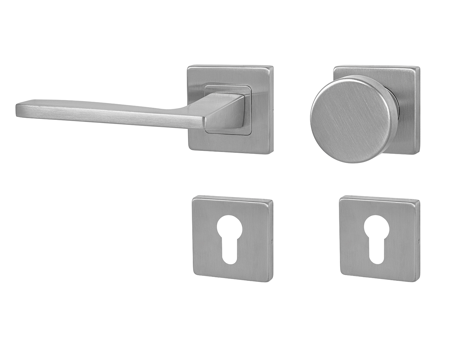 Rozetová klika na interiérové ​​dveře s hranatou rozetou je vyrobena z vysoce kvalitní nerezavějící oceli, známé jako nerez a je povrchově upravena. Rozeta má rozměry 54 mm x 54 mm a tloušťku 9 mm. Je barevně stabilní a odolná vůči opotřebení. Kování je testováno dle normy ČSN EN 1906: 2012 na 200 000 cyklů.