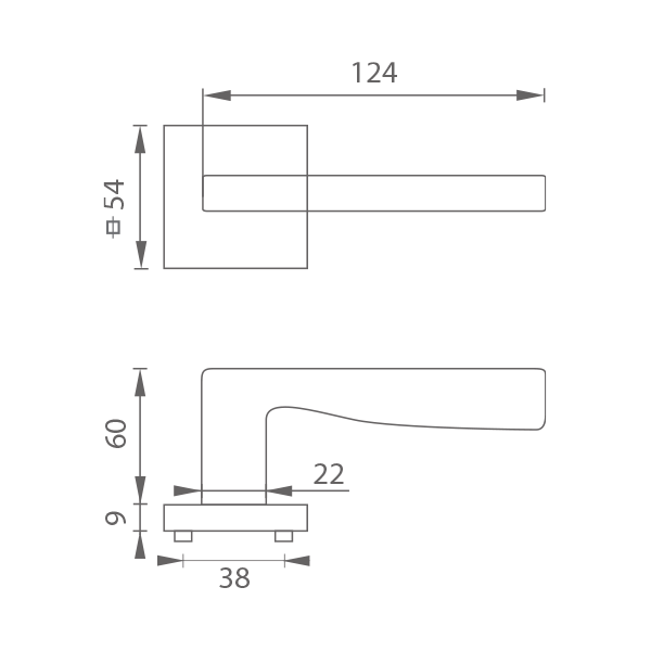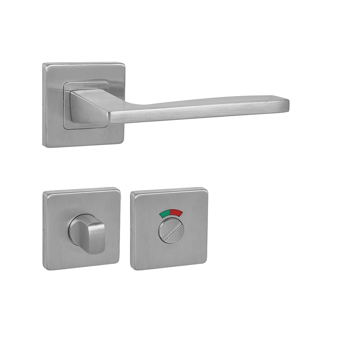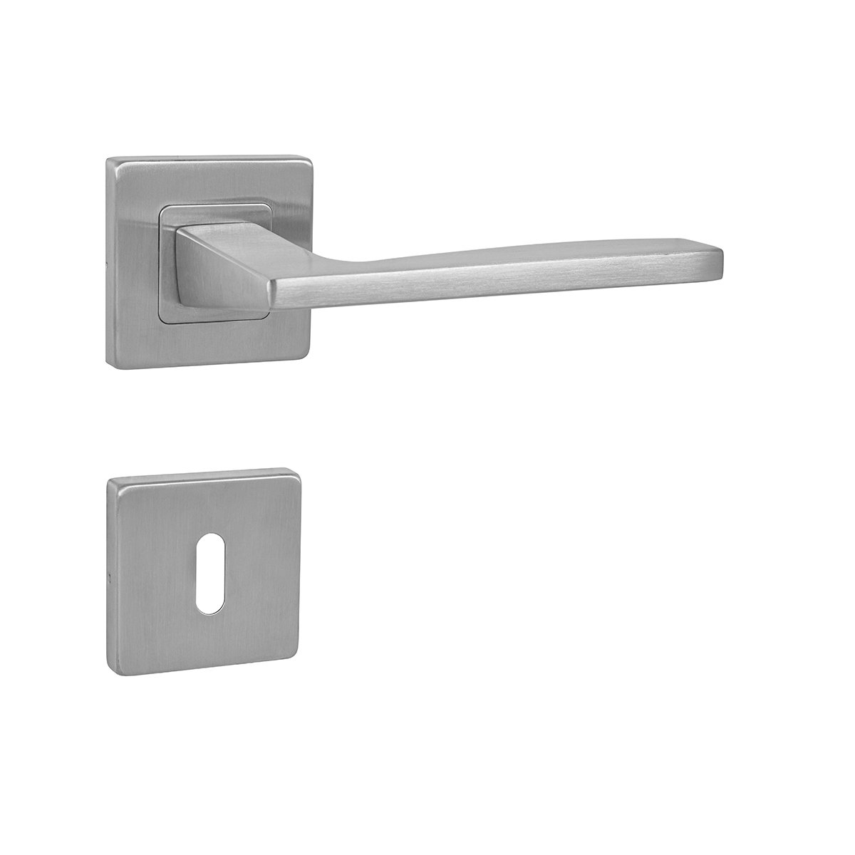 Rozetová klika na interiérové ​​dveře s hranatou rozetou je vyrobena z vysoce kvalitní nerezavějící oceli, známé jako nerez a je povrchově upravena. Rozeta má rozměry 54 mm x 54 mm a tloušťku 9 mm. Je barevně stabilní a odolná vůči opotřebení. Kování je testováno dle normy ČSN EN 1906: 2012 na 200 000 cyklů.