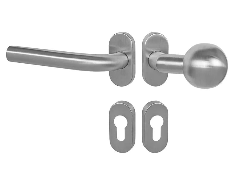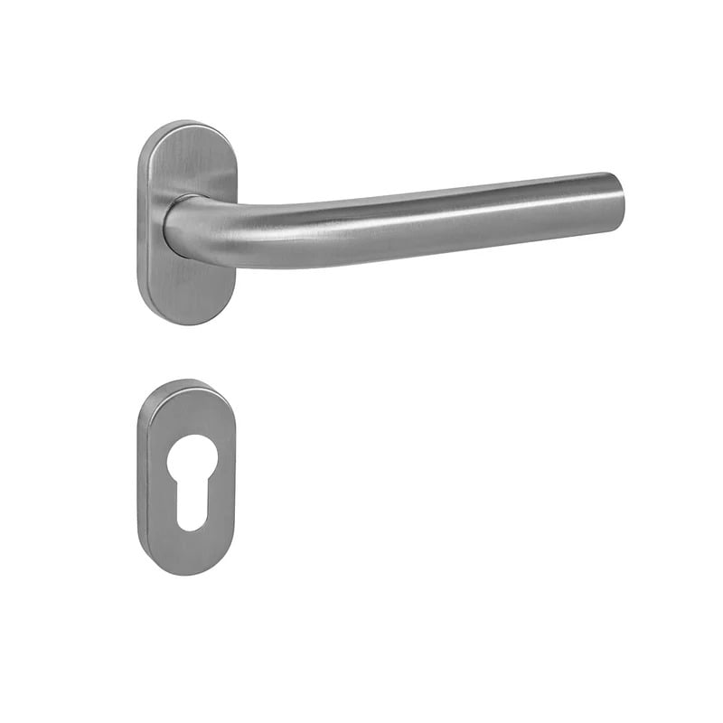 Rozetová klika s oválnou úzkou rozetou pro dveře s úzkým profilem (např.: zahradní branky a branky plotů) je vyrobena z vysoce kvalitní nerezavějící oceli, známé jako nerez a je povrchově upravena. Mechanismus kliky obsahuje vratnou pružinu.