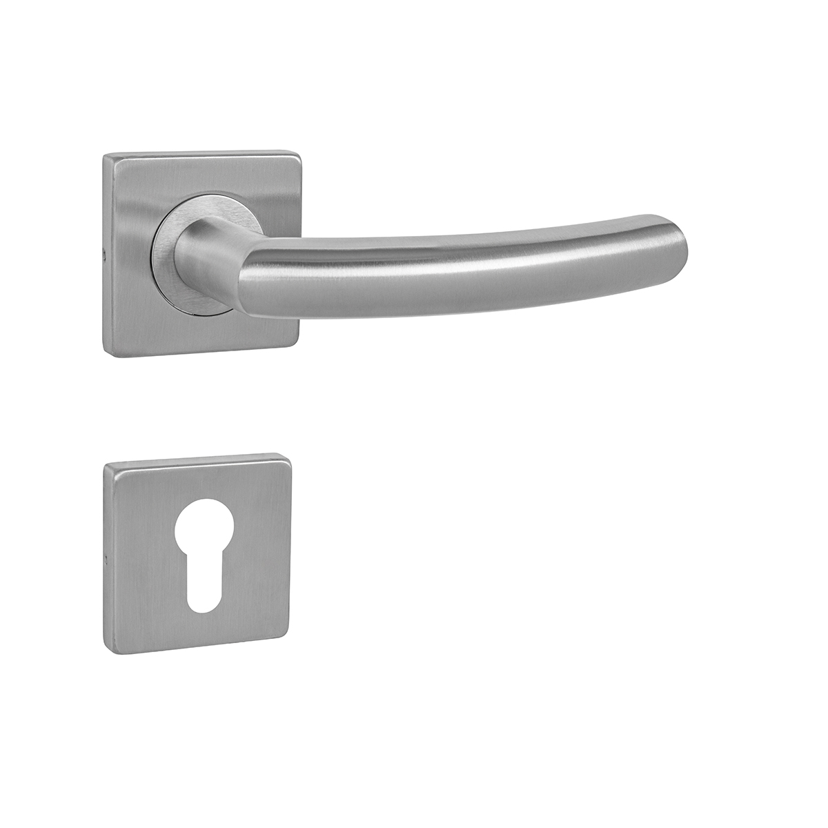 Rozetová klika na interiérové ​​dveře s hranatou rozetou je vyrobena z vysoce kvalitní nerezavějící oceli, známé jako nerez a je povrchově upravena. Rozeta má rozměry 54 mm x 54 mm a tloušťku 9 mm. Je barevně stabilní a odolná vůči opotřebení. Kování je testováno dle normy ČSN EN 1906: 2012 na 200 000 cyklů.
