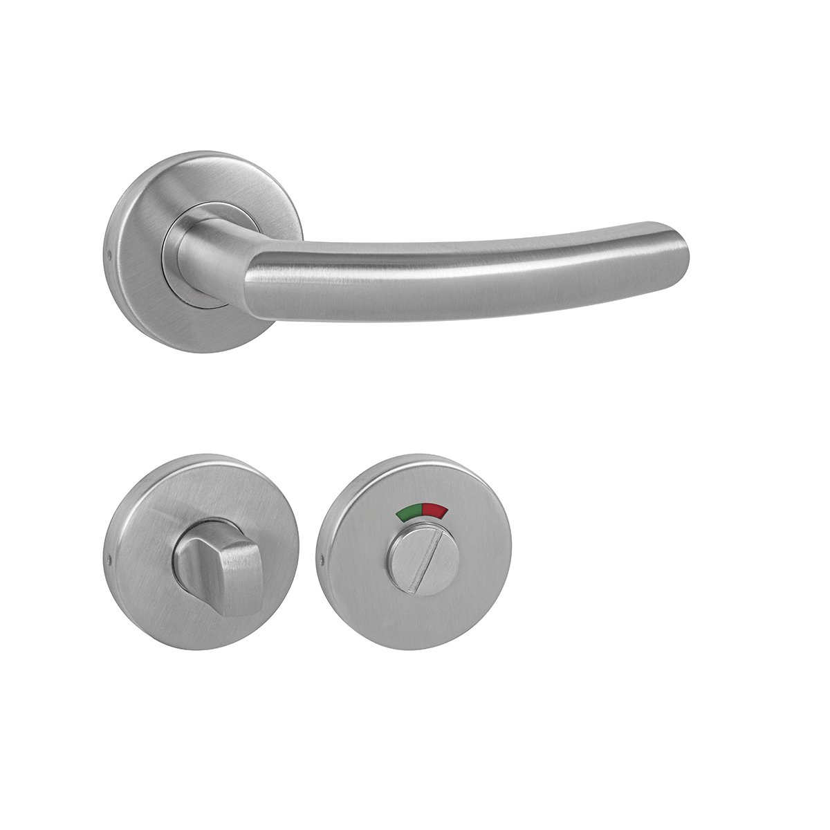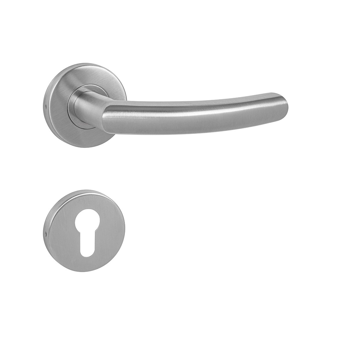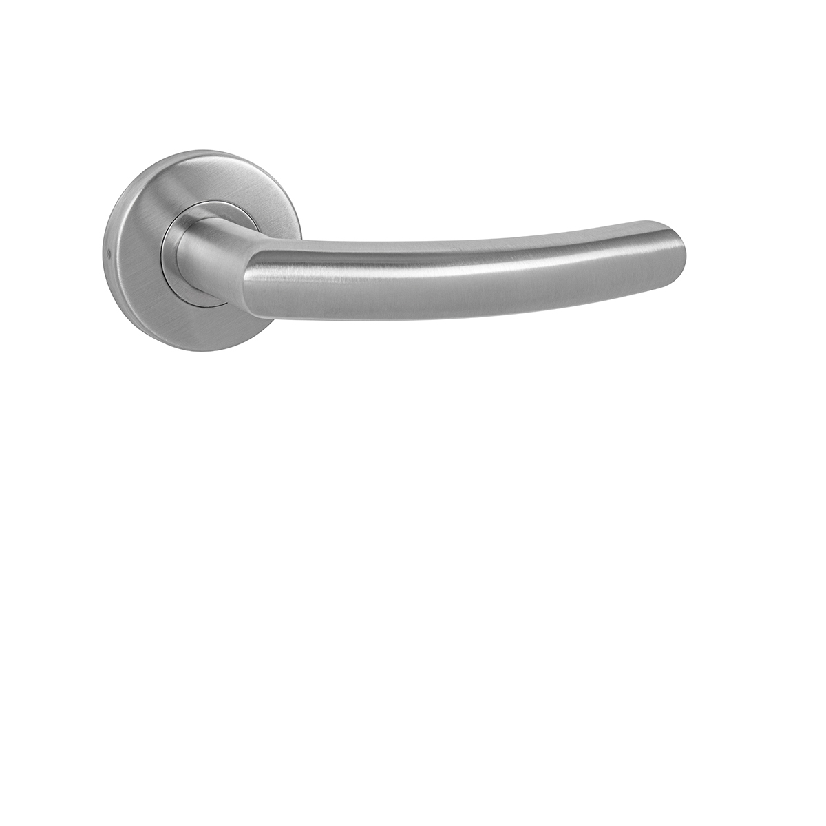 Rozetová klika na interiérové ​​dveře s kulatou rozetou z kvalitní nerezavějící oceli, známé jako nerez a je povrchově upravena. Rozeta má průměr 54 mm a tloušťku 9 mm. Je barevně stabilní a odolná vůči opotřebení. Kování je testováno dle normy ČSN EN 1906: 2012 na 200 000 cyklů.