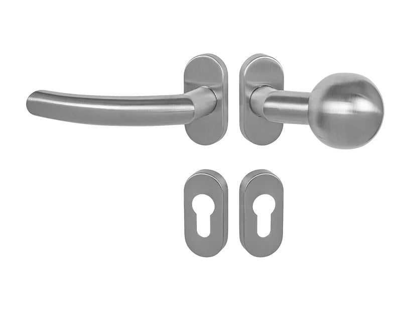 Rozetová klika s oválnou úzkou rozetou pro dveře s úzkým profilem (např.: zahradní branky a branky plotů) je vyrobena z vysoce kvalitní nerezavějící oceli, známé jako nerez a je povrchově upravena. Mechanismus kliky obsahuje vratnou pružinu.