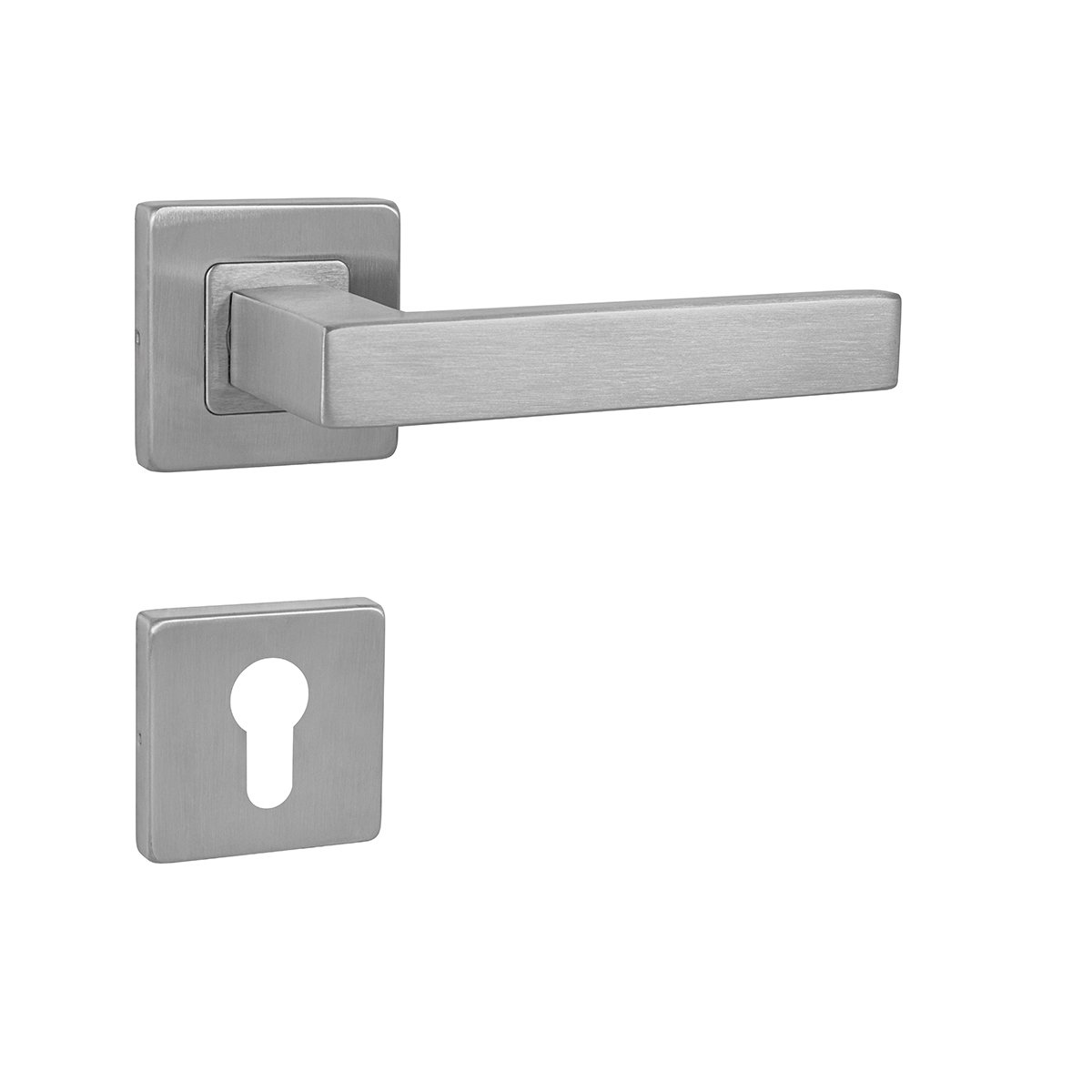 Rozetová klika na interiérové dveře s hranatou rozetou je vyrobena z vysoce kvalitní nerezavějící oceli, známé jako nerez a je povrchově upravena. Rozeta má rozměry 54 mm x 54 mm a tloušťku 9 mm. Je barevně stabilní a odolná vůči opotřebení. Kování je testované podle normy ČSN EN 1906:2012 na 200 000 cyklů.