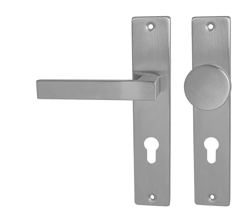 Štítová klika na interiérové ​​dveře s hranatým štítem je vyrobena z vysoce kvalitní nerezavějící oceli, známé jako nerez a je povrchově upravena. Hranatý štít má rozměry 42 mm x 218 mm.