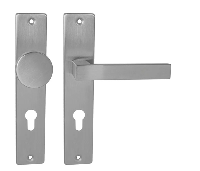 Štítová klika na interiérové ​​dveře s hranatým štítem je vyrobena z vysoce kvalitní nerezavějící oceli, známé jako nerez a je povrchově upravena. Hranatý štít má rozměry 42 mm x 218 mm.