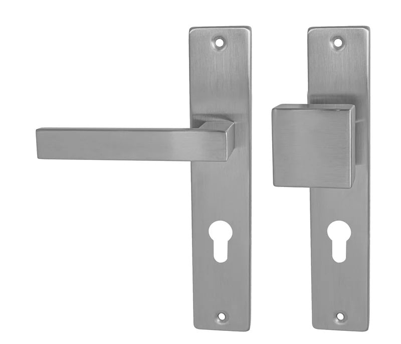 Štítová klika na interiérové ​​dveře s hranatým štítem je vyrobena z vysoce kvalitní nerezavějící oceli, známé jako nerez a je povrchově upravena. Hranatý štít má rozměry 42 mm x 218 mm.