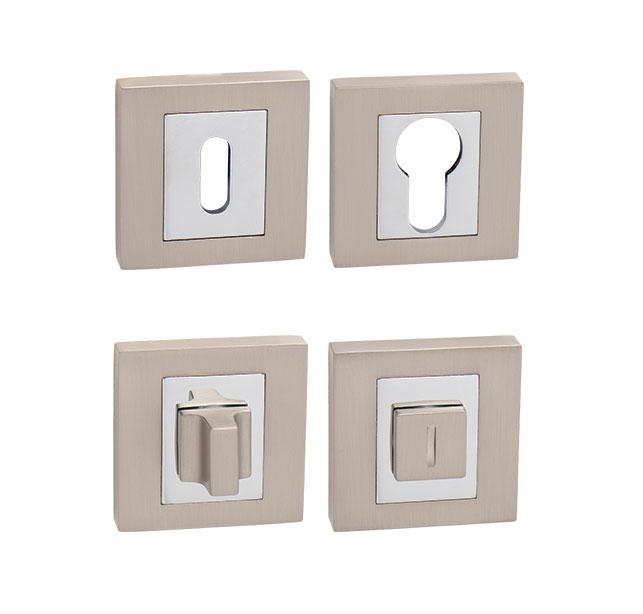 Hranatá rozeta je vyrobena ze zamaku a hliníku a je povrchově upravena. Rozeta má rozměry 52 mm x 52 mm, tloušťku 10 mm a oválný otvor pro interiérový klíč (BB), otvor pro cylindrickou vložku (PZ) nebo WC set s vmontovaným klíčem. Balení obsahuje 2 kusy rozet (pár) a rozety WC jsou v balení jako set.