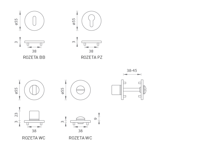 Kulatá rozeta je vyrobena z vysoce kvalitní nerezavějící oceli, známé jako nerez a je povrchově upravena. Rozeta má průměr 55 mm, tloušťku jen 3 mm a oválný otvor pro interiérový klíč (BB), otvor pro cylindrickou vložku (PZ) nebo WC set s vmontovaným klíčem. Balení obsahuje 2 kusy rozet (pár) a rozety WC jsou v balení jako set.