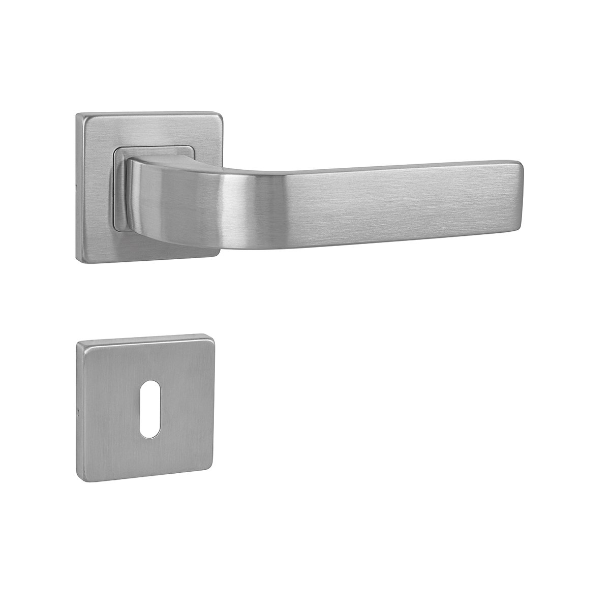 Rozetová klika na interiérové dveře s hranatou rozetou je vyrobena z vysoce kvalitní nerezavějící oceli, známé jako nerez a je povrchově upravena. Rozeta má rozměry 54 mm x 54 mm a tloušťku 9 mm. Je barevně stabilní a odolná proti opotřebení. Kování je testované podle normy ČSN EN 1906:2012 na 200 000 cyklů.