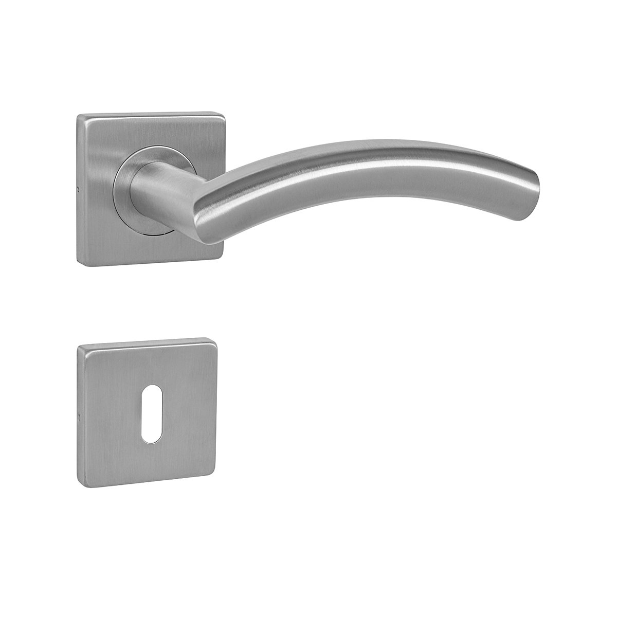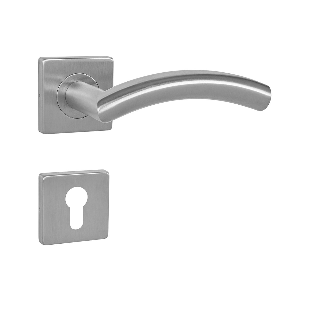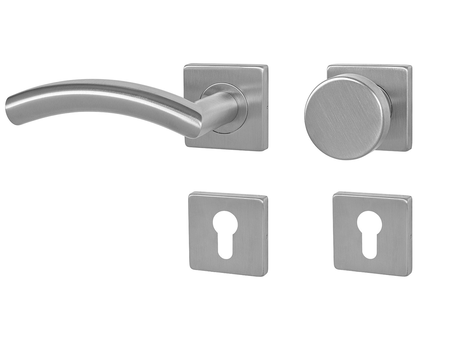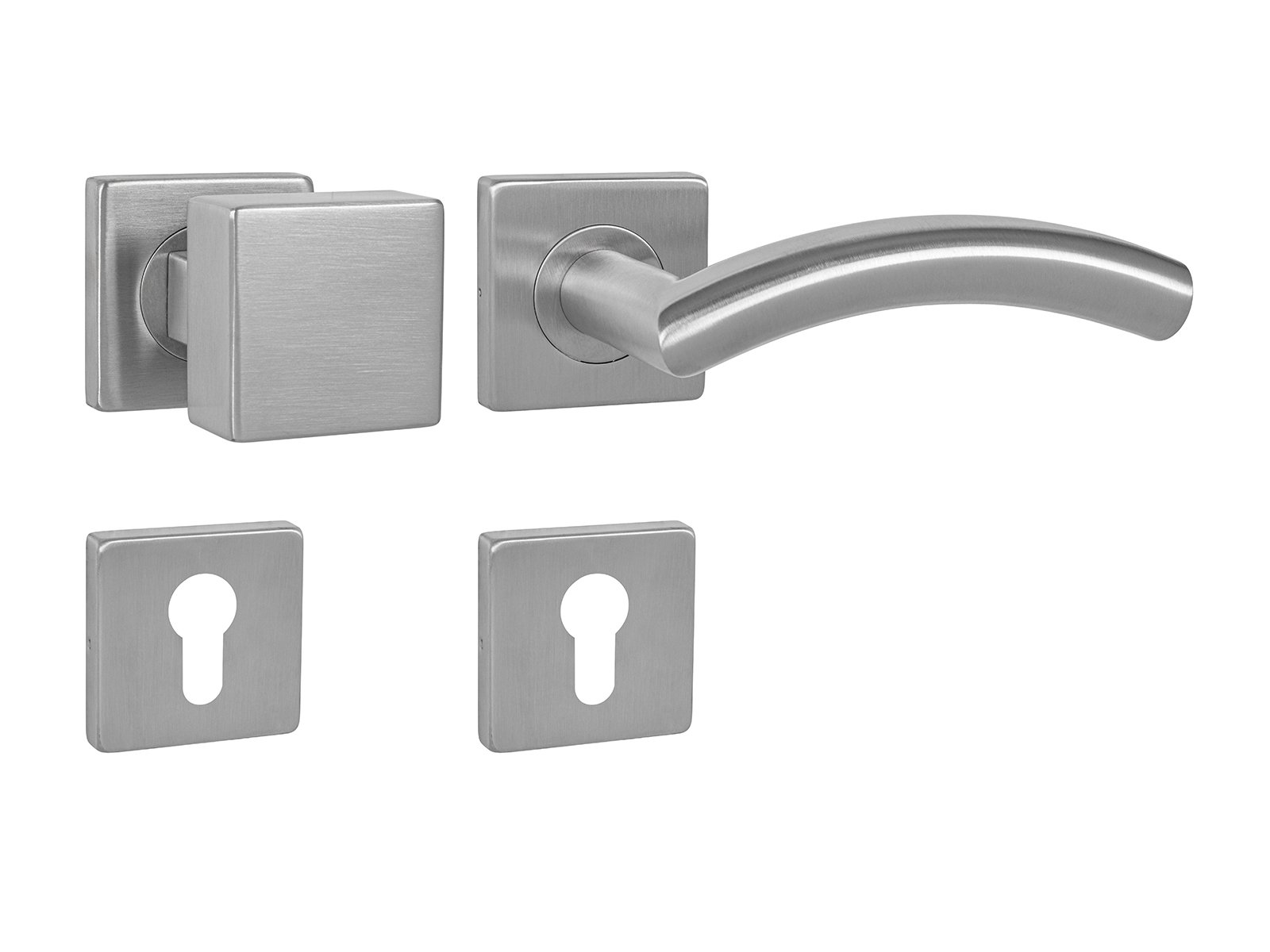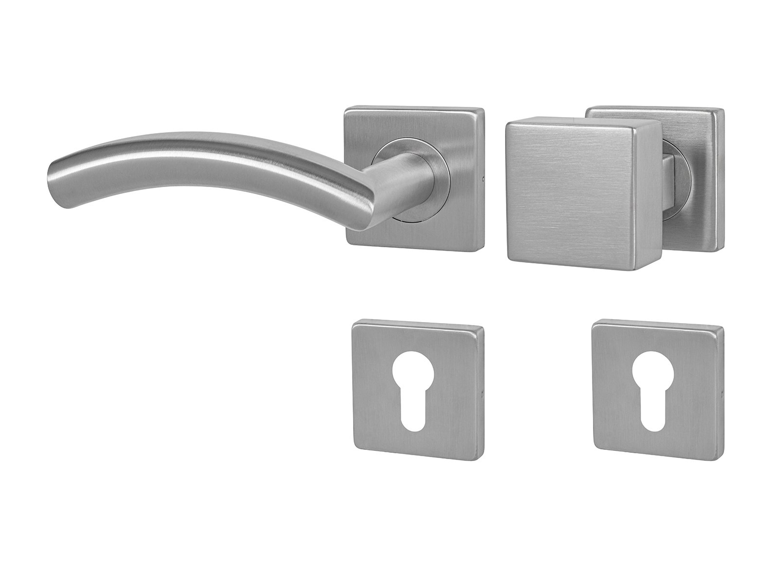 Rozetová klika na interiérové ​​dveře s hranatou rozetou je vyrobena z vysoce kvalitní nerezavějící oceli, známé jako nerez a je povrchově upravena. Rozeta má rozměry 54 mm x 54 mm a tloušťku 9 mm. Je barevně stabilní a odolná vůči opotřebení. Kování je testováno dle normy ČSN EN 1906: 2012 na 200 000 cyklů.