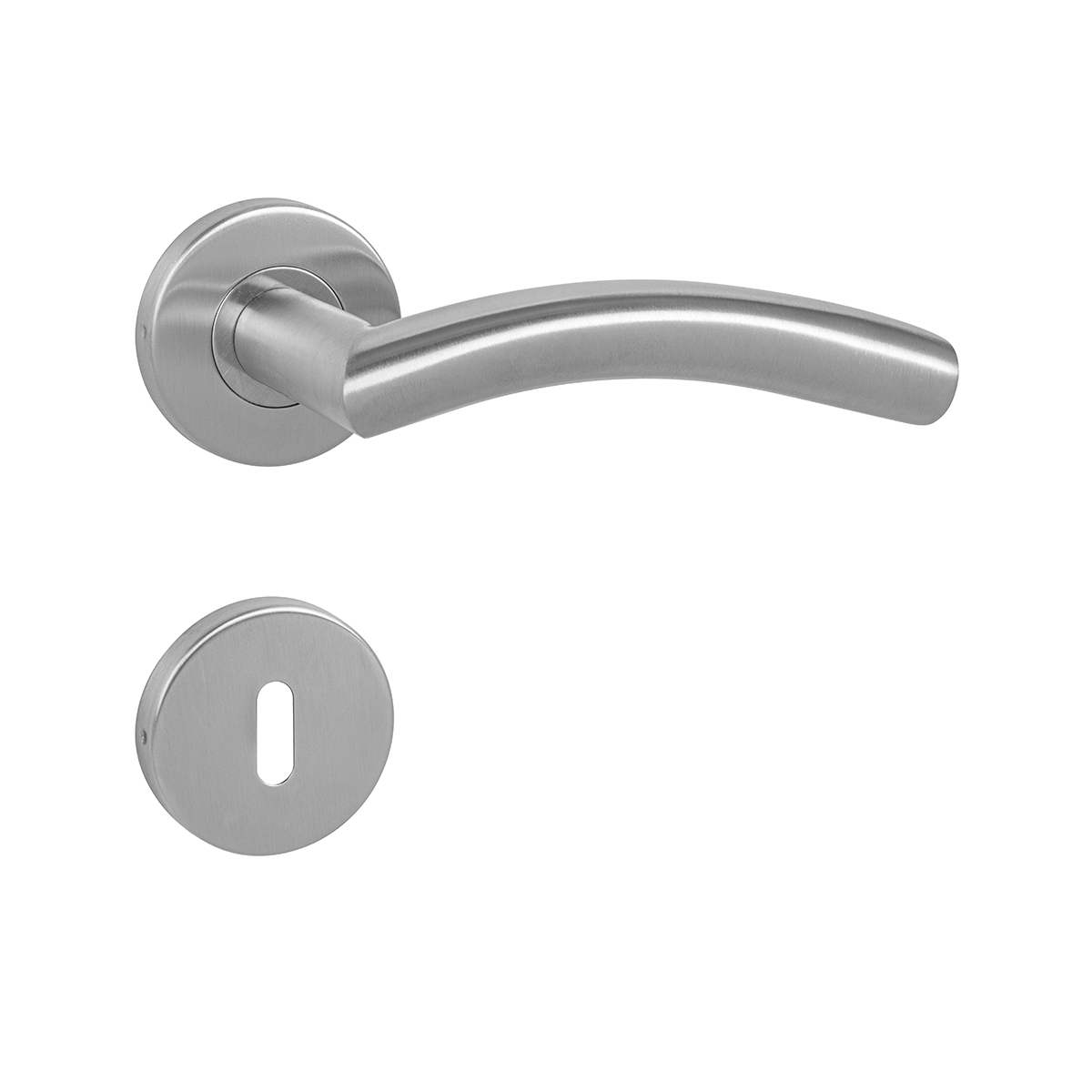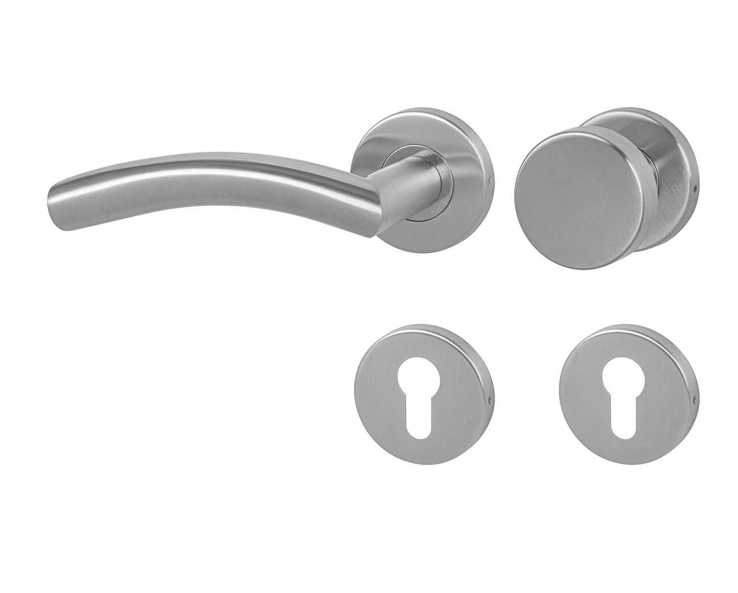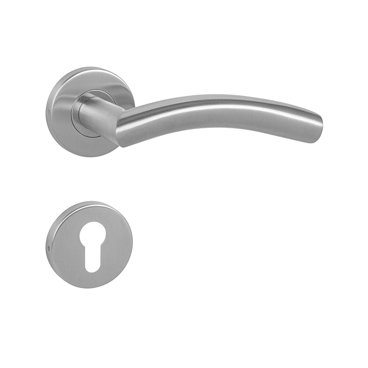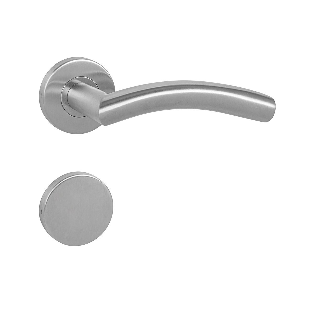 Rozetová klika na interiérové ​​dveře s kulatou rozetou z kvalitní nerezavějící oceli, známé jako nerez a je povrchově upravena. Rozeta má průměr 54 mm a tloušťku 9 mm. Je barevně stabilní a odolná vůči opotřebení. Kování je testováno dle normy ČSN EN 1906: 2012 na 200 000 cyklů.