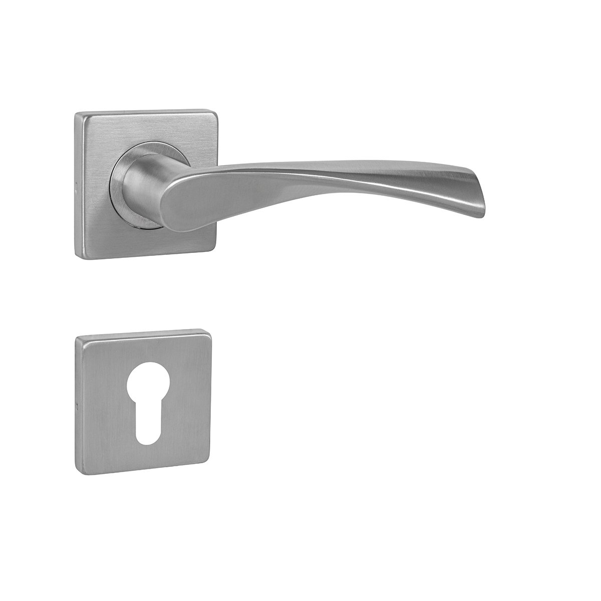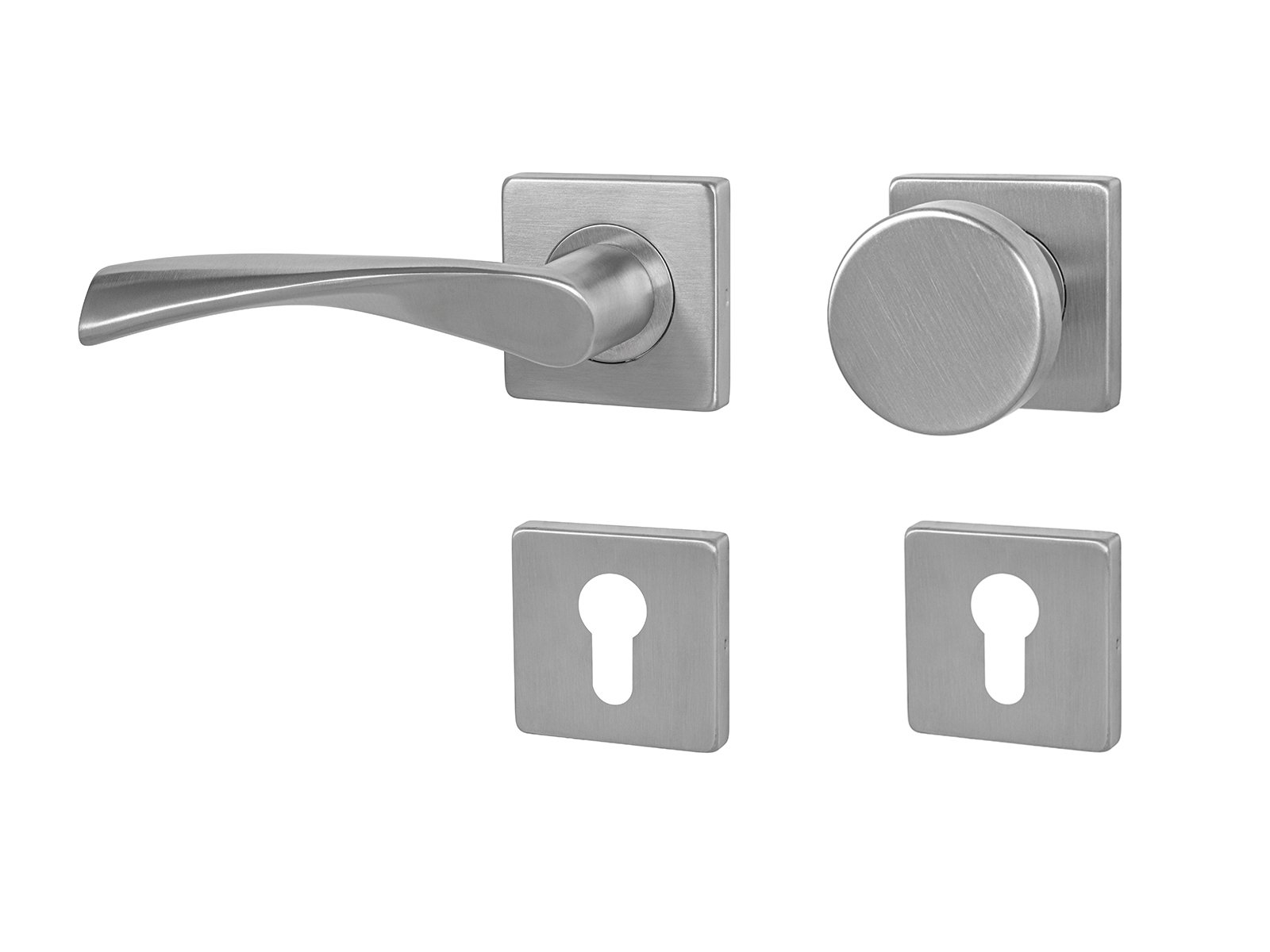 Rozetová klika na interiérové ​​dveře s hranatou rozetou je vyrobena z vysoce kvalitní nerezavějící oceli, známé jako nerez a je povrchově upravena. Rozeta má rozměry 54 mm x 54 mm a tloušťku 9 mm. Je barevně stabilní a odolná vůči opotřebení. Kování je testováno dle normy ČSN EN 1906: 2012 na 200 000 cyklů.