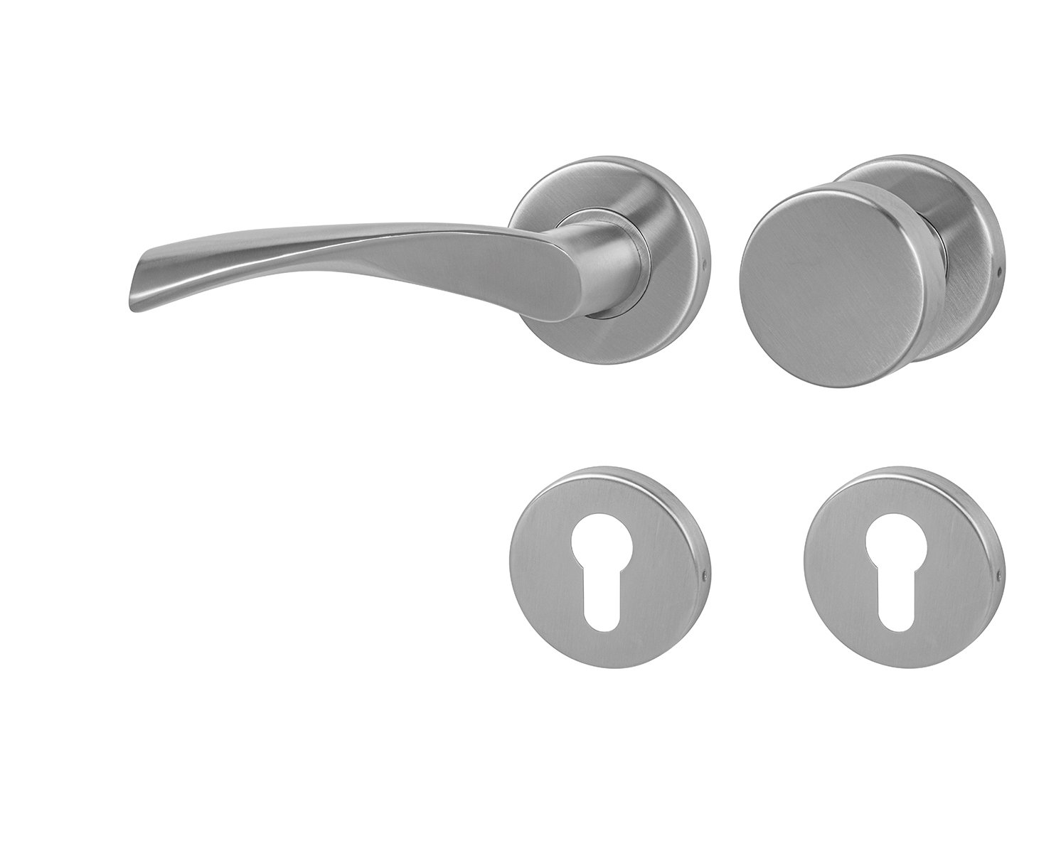 Rozetová klika na interiérové ​​dveře s kulatou rozetou z kvalitní nerezavějící oceli, známé jako nerez a je povrchově upravena. Rozeta má průměr 54 mm a tloušťku 9 mm. Je barevně stabilní a odolná vůči opotřebení. Kování je testováno dle normy ČSN EN 1906: 2012 na 200 000 cyklů.