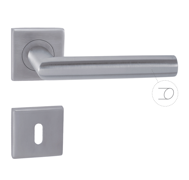 Rozetová klika na interiérové ​​dveře s hranatou rozetou je vyrobena z vysoce kvalitní nerezavějící oceli, známé jako nerez a je povrchově upravena. Rozeta má rozměry 54 mm x 54 mm a tloušťku 9 mm. Je barevně stabilní a odolná vůči opotřebení. Kování je testováno dle normy ČSN EN 1906: 2012 na 200 000 cyklů.