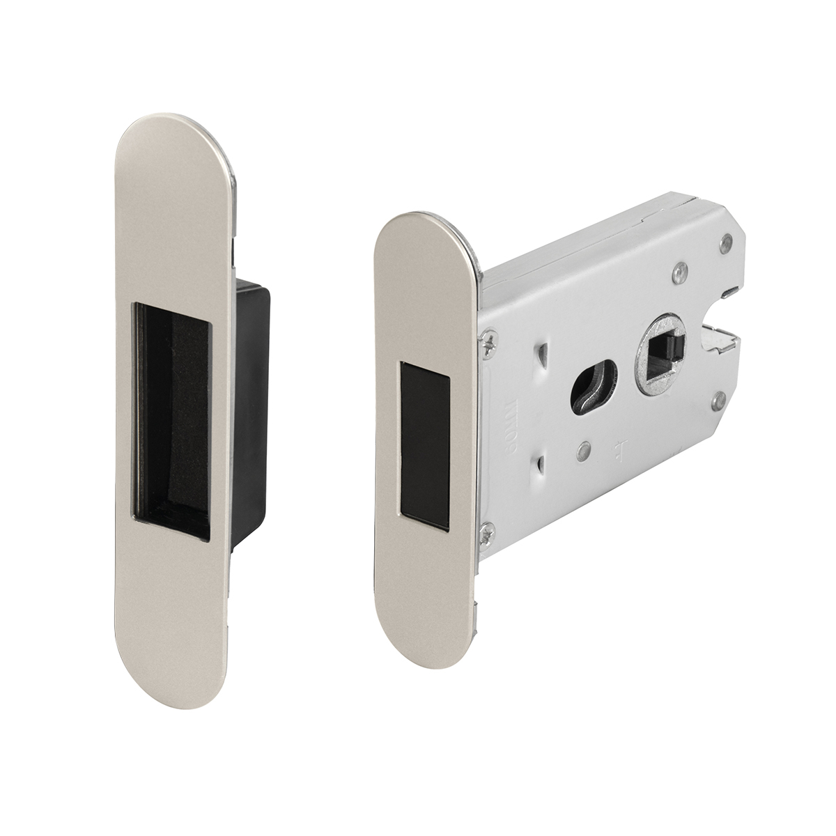 Magnetický zámek je určený pro bezfalcové interiérové dveře, pro kliky bez spodní rozety a kliky s integrovaným uzamykáním. Montážní šrouby jsou překryté elegantní barevnou krytkou. Nastavitelný protiplech k magnetickému zámku je součástí balení.