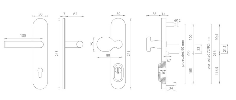U bezpečnostního kování je třeba znát vzdálenost mezi osou kliky a osou klíče (rozteč). Standardní vzdálenost je 72, 90 nebo 92 mm. Kování je standardem pro tloušťku dveří od 40 do 60 mm. V případě, že máte jinou tloušťku dveří, uveďte údaj do poznámky v objednávce.