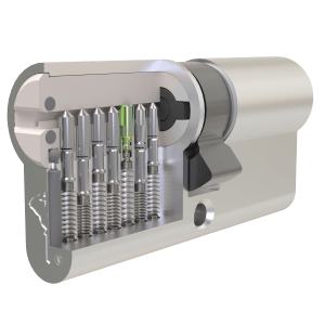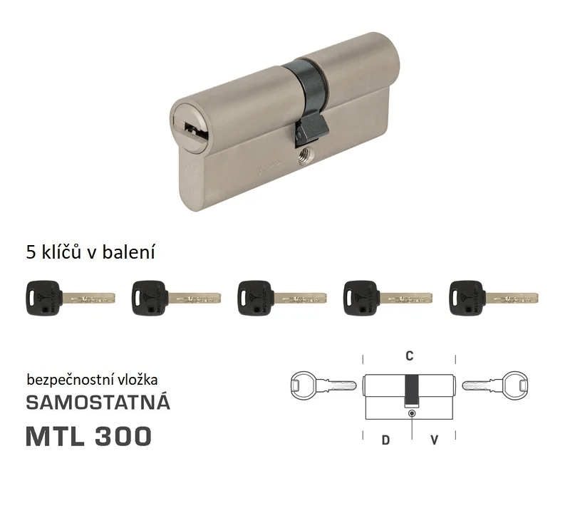 Bezpečnostní cylindrická vložka MTL300 od Mul-T-Locku je základní bezpečnostní vložka s vysokou ochranou proti vlámání. Vložka obsahuje 7 stavítek v řadě a jedno speciálně patentované teleskopické stavítko, které výrazně zvyšuje její bezpečnostní úroveň.