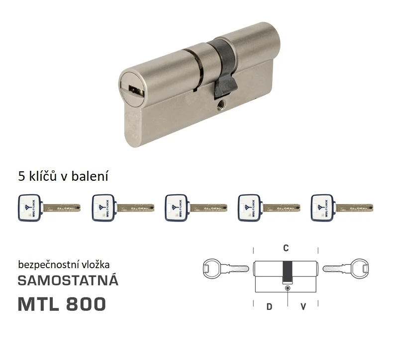 Bezpečnostní cylindrická vložka MTL800 od Mul-T-Locku, též známá jako MT5+ se vyznačuje nejvyšší úrovní bezpečnosti. Vložka obsahuje unikátní systém 10ti teleskopických stavítek v řade a 5 neodpružených stavítek, které ovládají blokovací lištu pomocí hadovitého zářezu v klíči. Vložka obsahuje také excentrické interaktivní stavítko ovládané tzv. „dvojitou alfou“ pružinou. Tento systém zvyšuje bezpečnostní úroveň vložky.