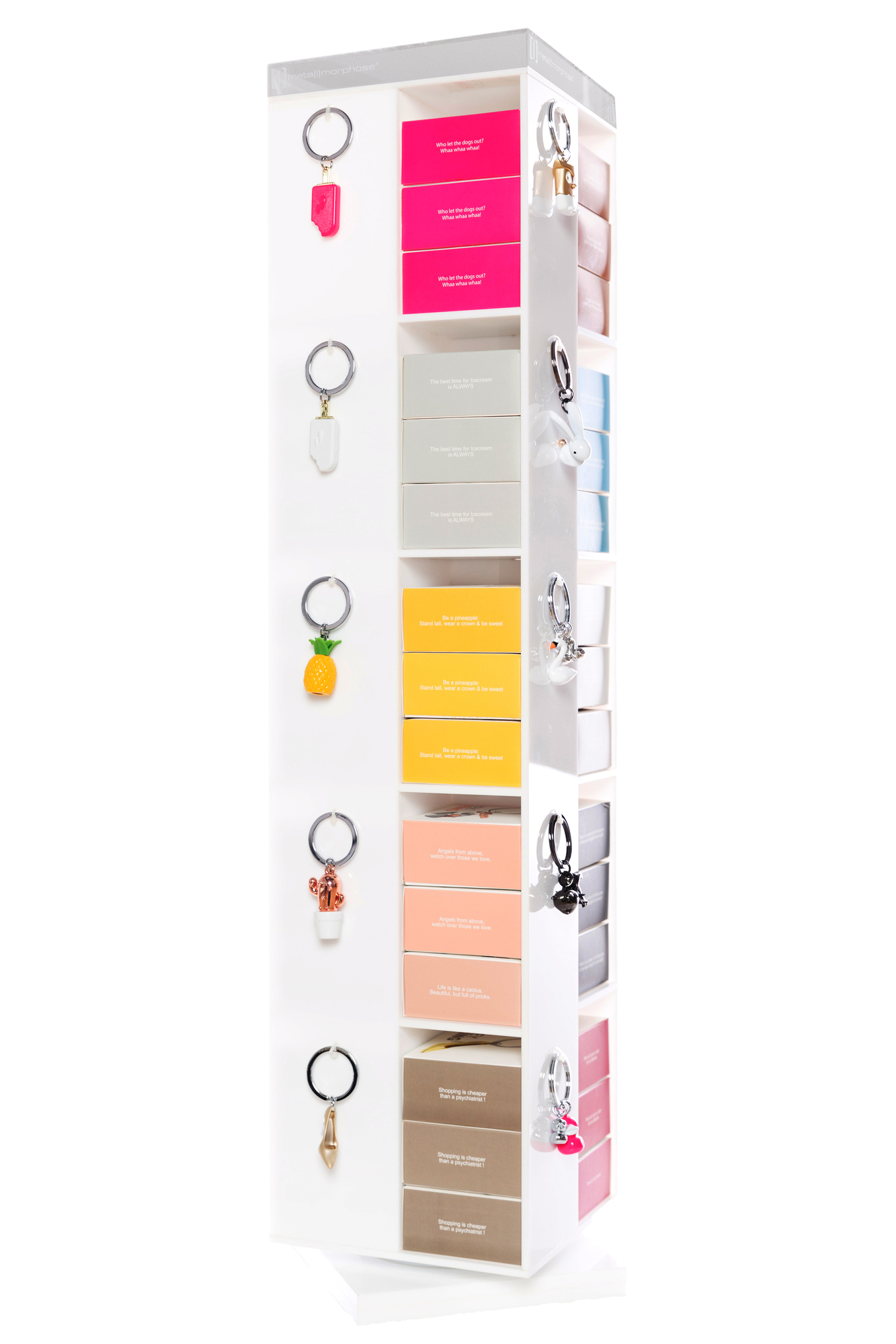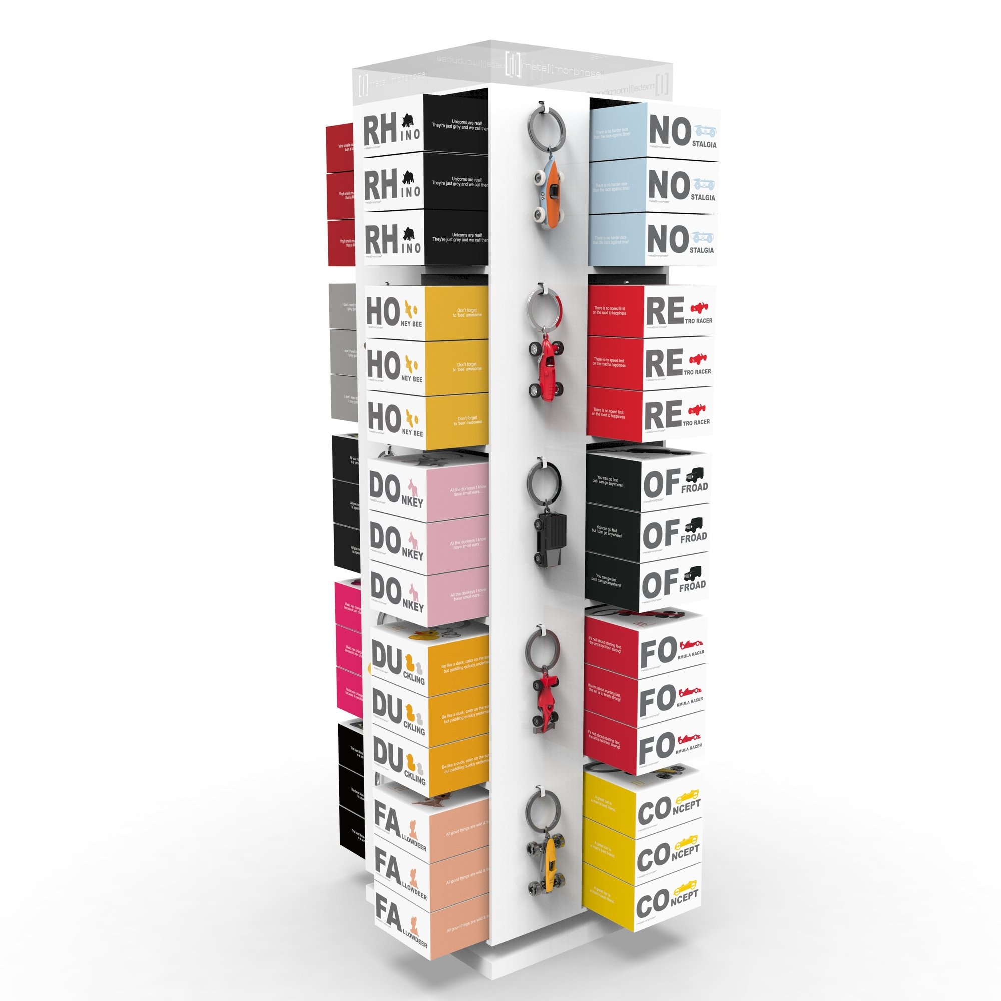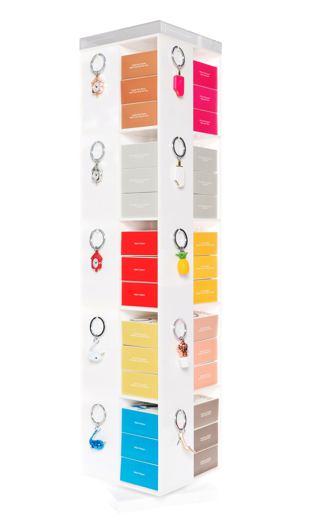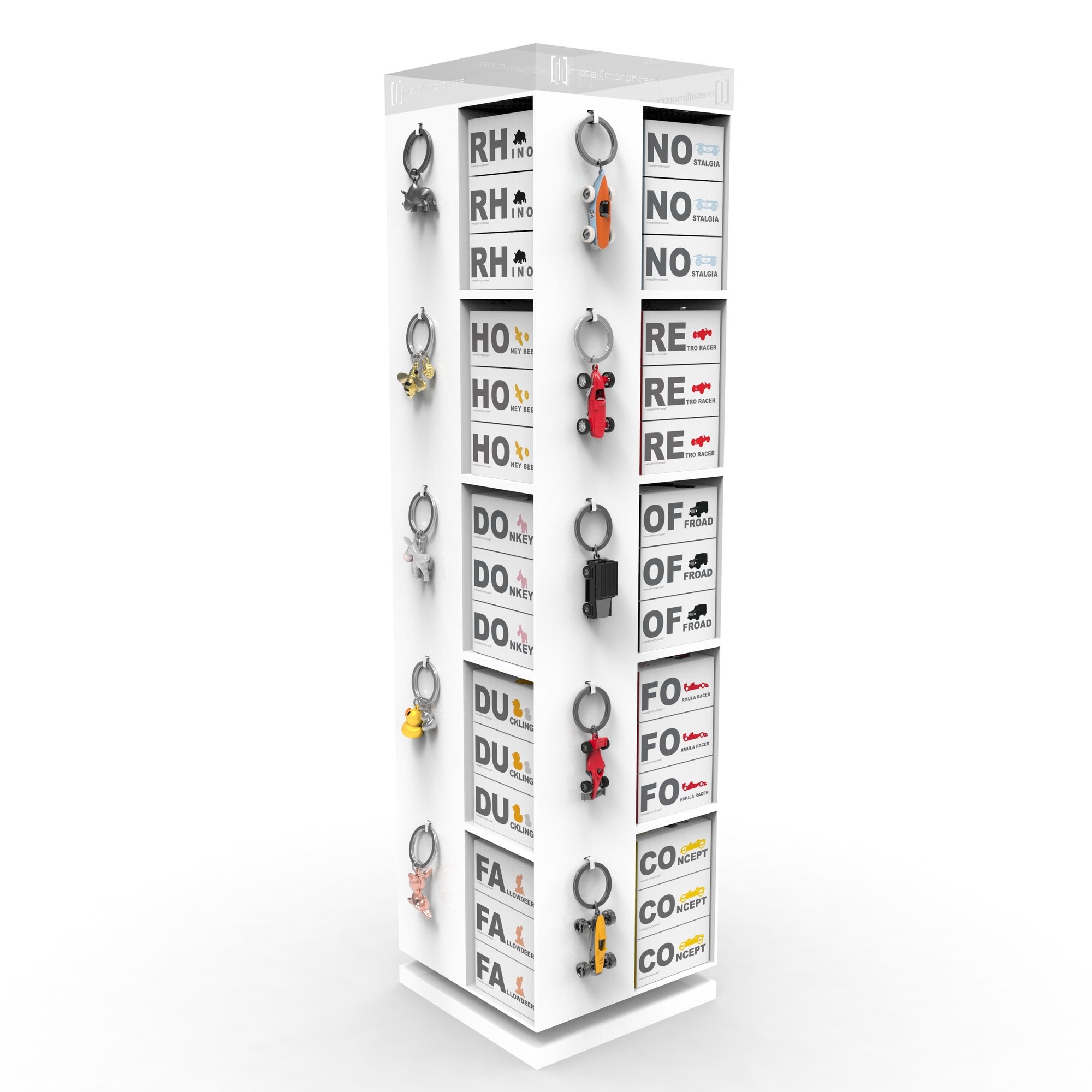 Střední otočný stojan na klíčenky MTM. Stojan obsahuje 20 poliček a 20 věšáčků na klíčenky.