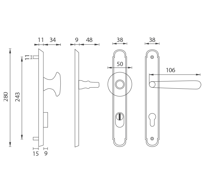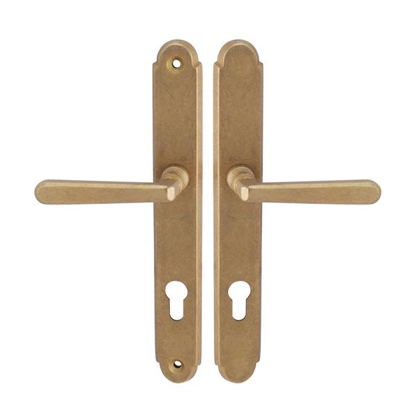 Štítová klika na vchodové a bezpečnostní dveře se zpevněným rustikálním štítem bez překrytí cylindrické vložky je vyrobena z materiálů vysoké kvality - mosaz a je povrchově upravena. Rustikální štít má rozměry 38 mm x 280 mm a tloušťku 11 mm.