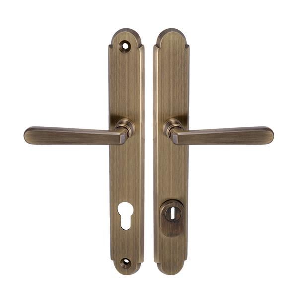 Štítová klika na vchodové a bezpečnostní dveře se zpevněným rustikálním štítem s překrytím cylindrické vložky je vyrobena z materiálů vysoké kvality – mosaz a je povrchově upravena. Rustikální štít má rozměry 38 mm x 280 mm a tloušťku 11 mm.