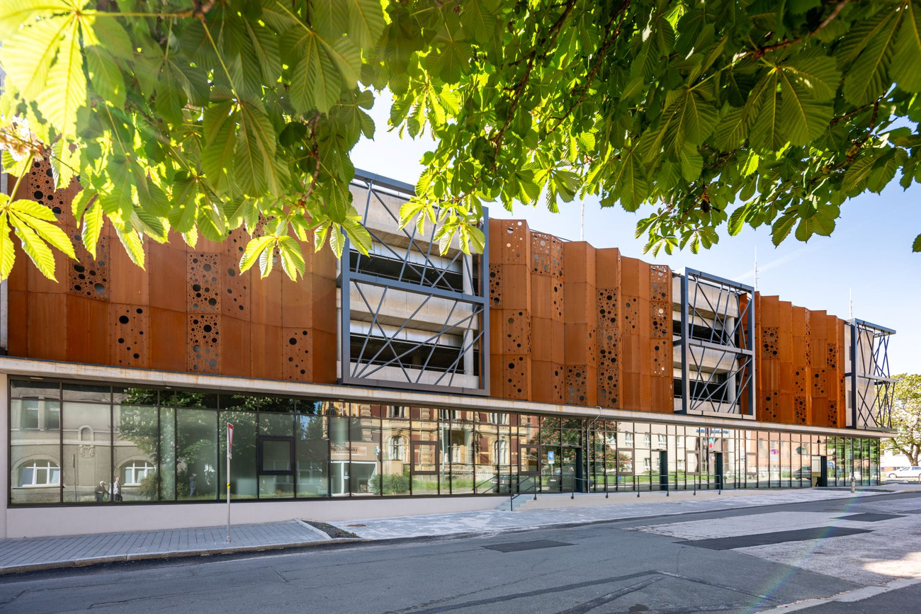 Pro parkovací dům v Ostravě jsme vyráběli cortenovou fasádu, ocelové konstrukce i mobiliář.