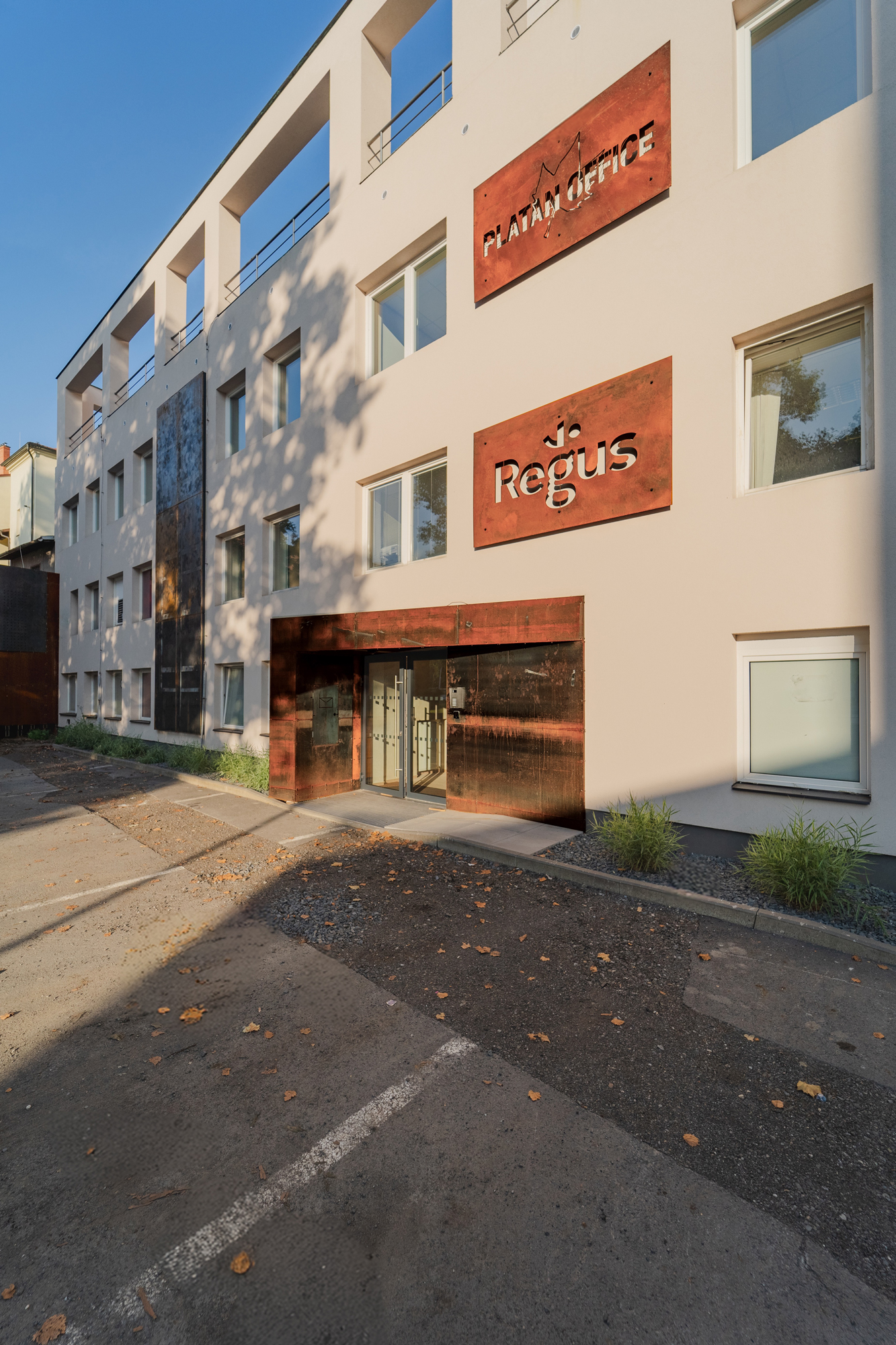 Cortenové vstupy, fasádní prvky i loga na míru dotváří industriální charakter Platan Office.