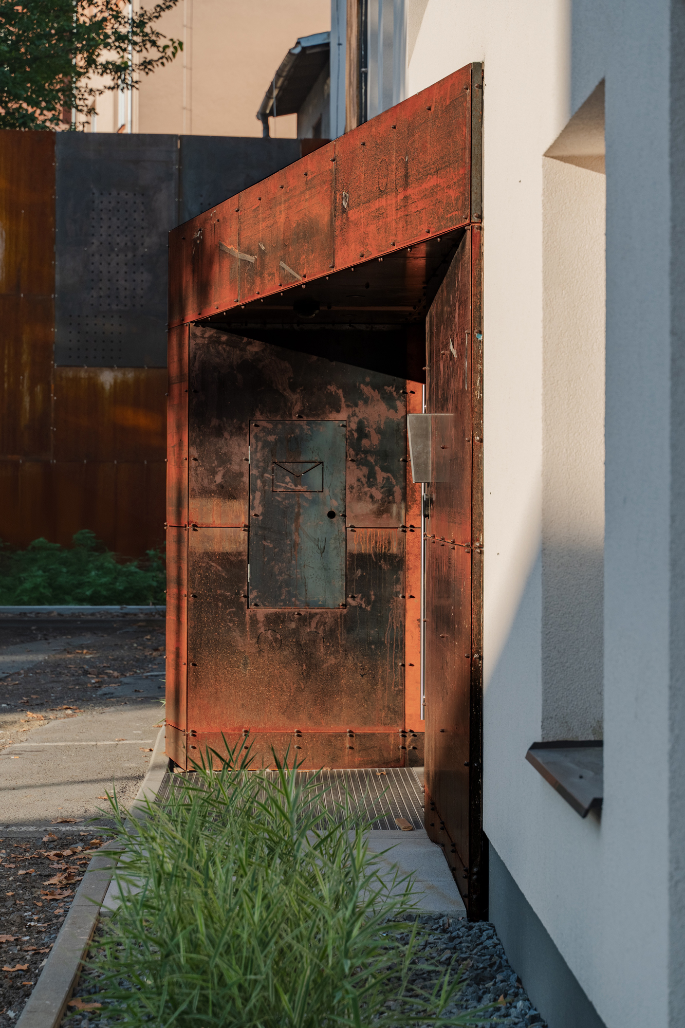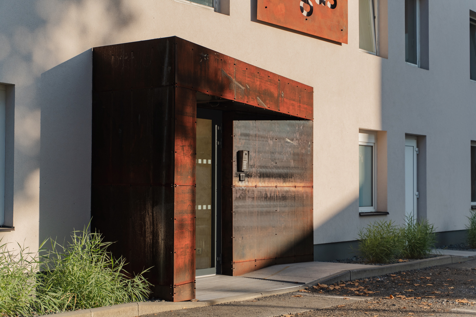Navrhli a vyrobili jsme vstupní portál z cortenové oceli, který tvoří výrazný prvek hlavního vstupu do budovy. Tento materiál s charakteristickou rezavou patinou dodává objektu jedinečný vzhled a zajišťuje dlouhou životnost bez nutnosti další údržby.
