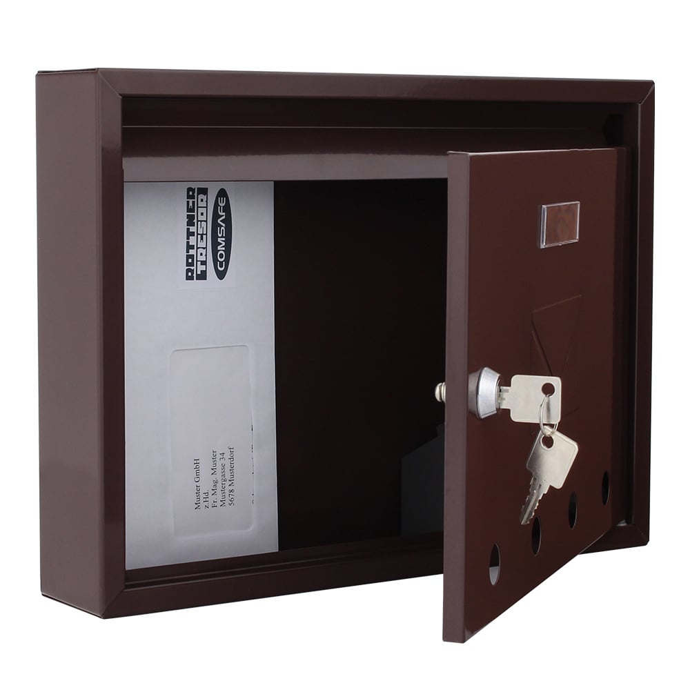 Na přední straně schránky je otvor pro vhoz a výběr pošty. Součástí balení jsou 2 klíče.