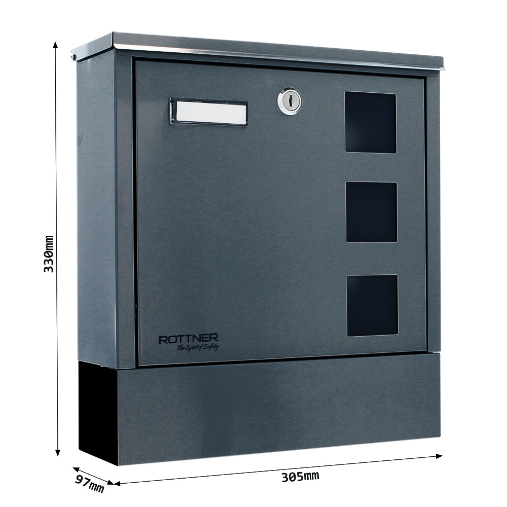 Ocelová poštovní schránka LAGO má horný vhoz s krytkou, která chrání zásilky před deštěm a nečistotami. Poštu jednoduše vyberete díky velkým předním dvířkám, které se odklápějí směrem dolů. V levé horní části schránky je prostor na jmenovku. Schránka je doplněná v dolní části o box pro noviny a časopisy. Tři transparentní okénka rychle prozradí, jestli schránka obsahuje poštu. Součástí balení je i upevňovací materiál, pomocí kterého lehce upevníte schránku na stěnu přes otvory na zadní straně.