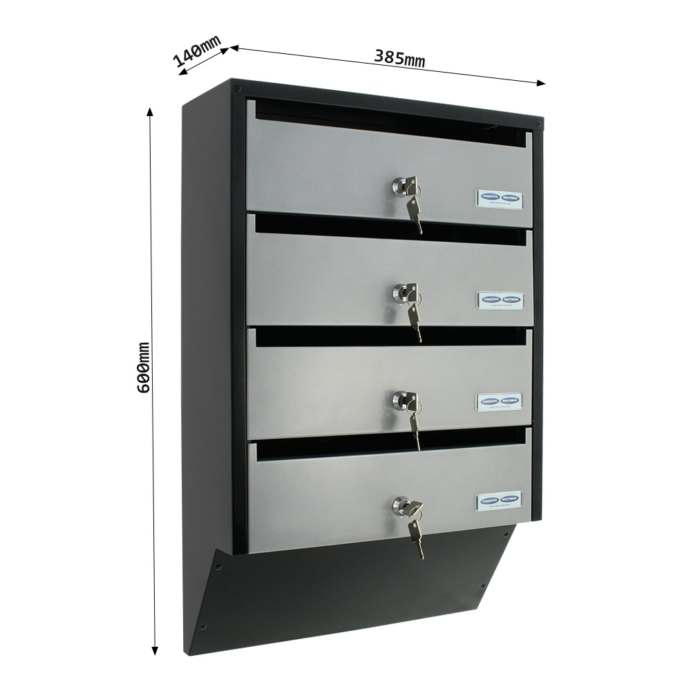 Poštovní schránka DEPOT 4 obsahuje 4 samostatné složky. Každou složku je možné uzamknout a ke každé složce se dodávají 2 klíče. Jednotlivé složky mají v pravé dolní části prostor na jmenovku a velké přední dvířka na vyzvednutí doručené pošty, které se otvírají směrem nahoru. Poštovní schránka Depot 4 je vhodná pro bytové domy a polyfunkční objekty. Na zadní straně jsou připravené otvory na upevnění. Materiál na upevnění je součástí balení.