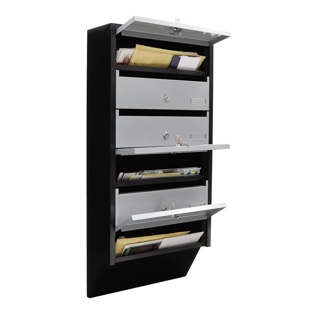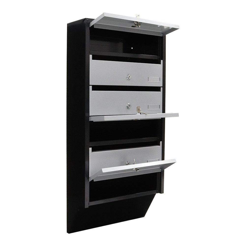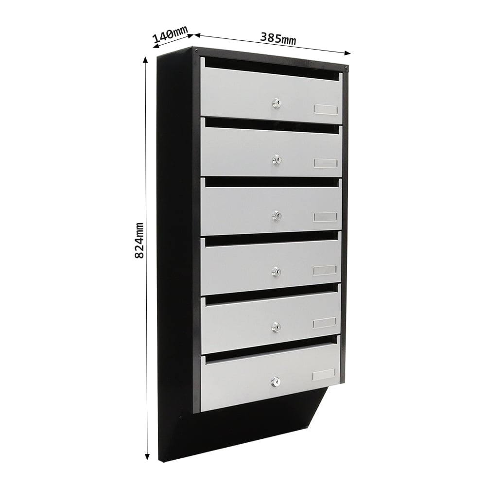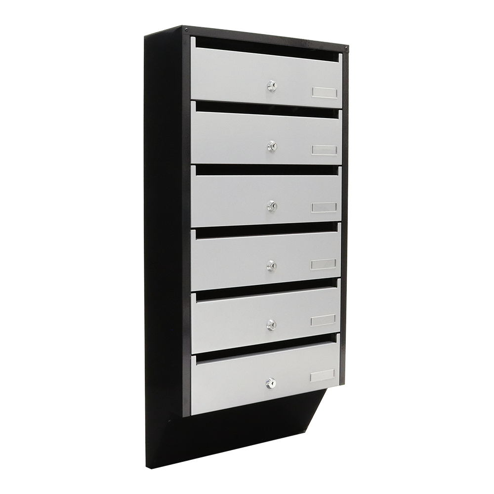 Poštovní schránka DEPOT 6 obsahuje 6 samostatných složek. Každou složku je možné uzamknout a ke každé složce se dodávají 2 klíče. Jednotlivé složky mají v pravé dolní části prostor na jmenovku a velké přední dvířka na vyzvednutí doručené pošty, které se otvírají směrem nahoru. Poštovní schránka Depot 6 je vhodná pro bytové domy a polyfunkční objekty. Na zadní straně jsou připravené otvory na upevnění. Materiál na upevnění je součástí balení.