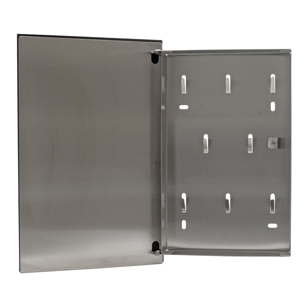 Skříňka na klíče KEY GLASS upoutá moderním designem se skleněnými předními dvířky a zavíráním na magnet. Uvnitř skříňky je prostor pro 8 klíčů. Součástí balení je i držák s magnetem a perem. Na skleněná magnetická dvířka můžete napsat informaci perem nebo můžete připevnit vzkaz magnetem. Balení obsahuje potřebný kotvící materiál pro připevnění na stěnu. Na zadní straně se nachází otvory na ukotvení.