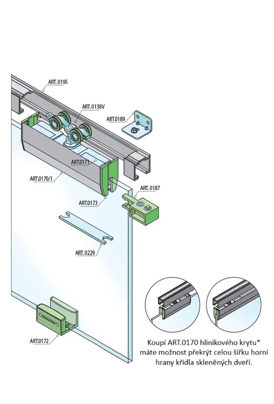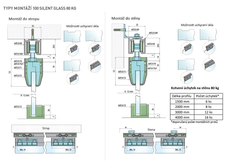 Balení posuvného systému SILENT GLASS obsahuje krytky na překrytí držáků skla, ale je možné dokoupit si hliníkový kryt pro překrytí celé šířky skleněných dveří. Systém SILENT GLASS umožňuje uchycení skla s řezem těsně na hraně, uchycení skla s řezem od okraje skla nebo uchycení bez řezu skla.