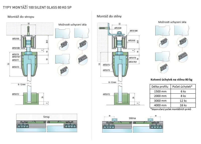 pro montáž do stěny nutno zakoupit si samostatně úchytky na montáž kolejnice (ART. 0189). Úchytky nejsou součástí balení. Pro křídla menší než 720 mm lze použít pouze 1 ks zpomalovače.